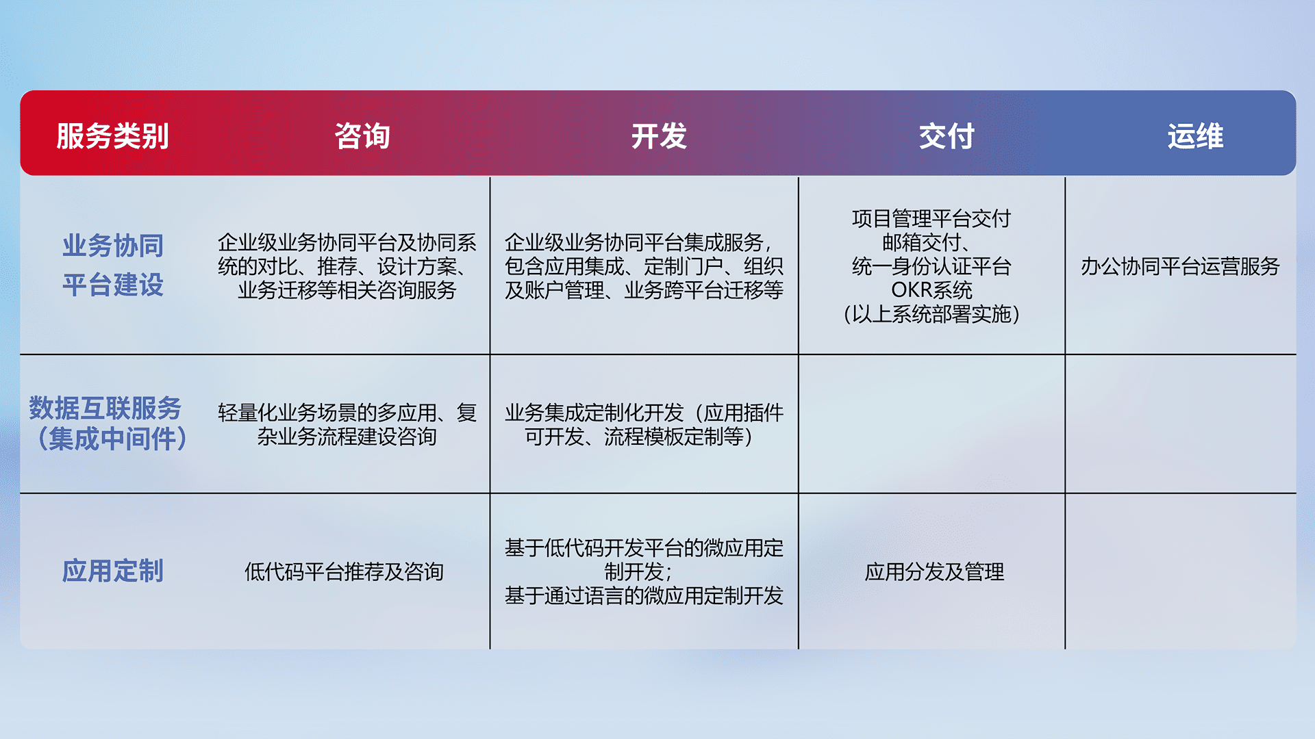 针对钉钉、、、、企微、、IDaas等平台级产品提供产品的规划、、、、方案、、交付、、、定制化开发等服务,,,实现如统一协同办公、、、智能客户服务、、混合会议管理、、、、智能数据查询、、等业务场景,,实现数字化转型。。
