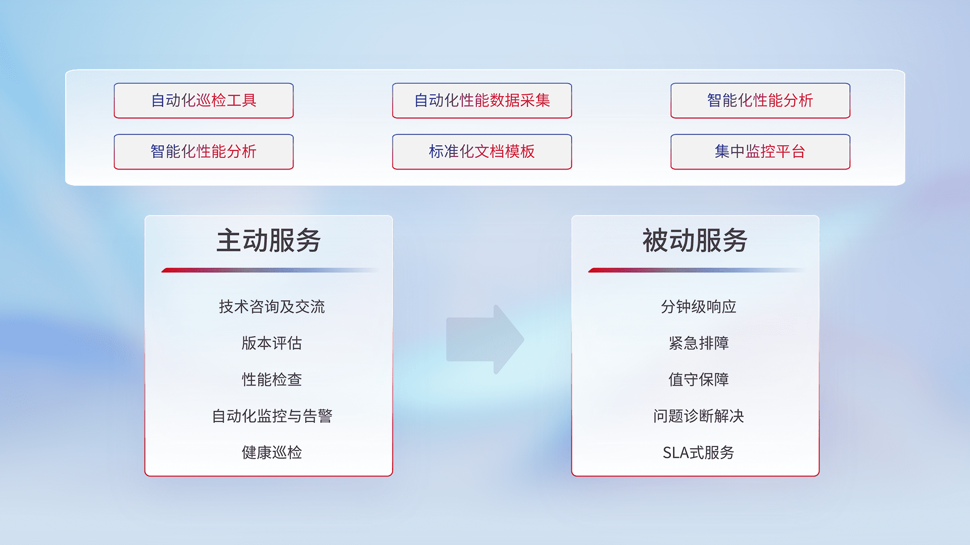 智能化工具和标准化文档,,,保障服务质量,,,,提供主动服务(包含技术咨询、、版本评估、、、性能检查、、、自动化监控与告警、、健康巡检)和被动服务包含(分钟级响应、、、、紧急排障、、、、值守保障、、问题诊断解决、、、、SLA服务)。。。